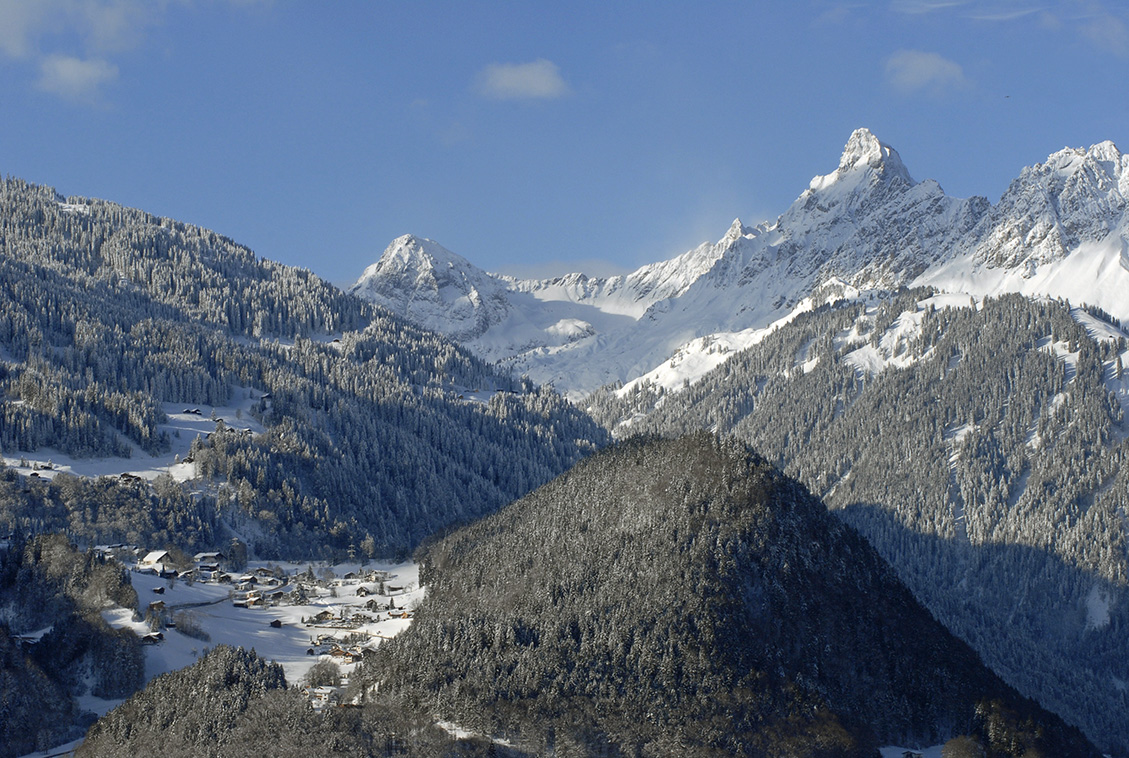 Blick von Schruns-Hof nach Tschagguns mit Kristakopf und Zimba, 2.643 Meter. (Foto: Gerhard Scopoli, 19. Dezember 2010)