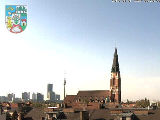 Blick über Floridsdorf mit Fokus auf die Kirche am Kinzerplatz. Webcam auf ca. 162 Meter Seehöhe. (Quelle: wetter.donaufeld.at)