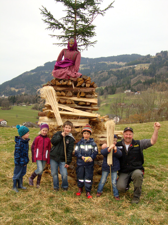 Zunftobmann Martin Bischof mit der Dorfjugend vor dem Kinderfunken.