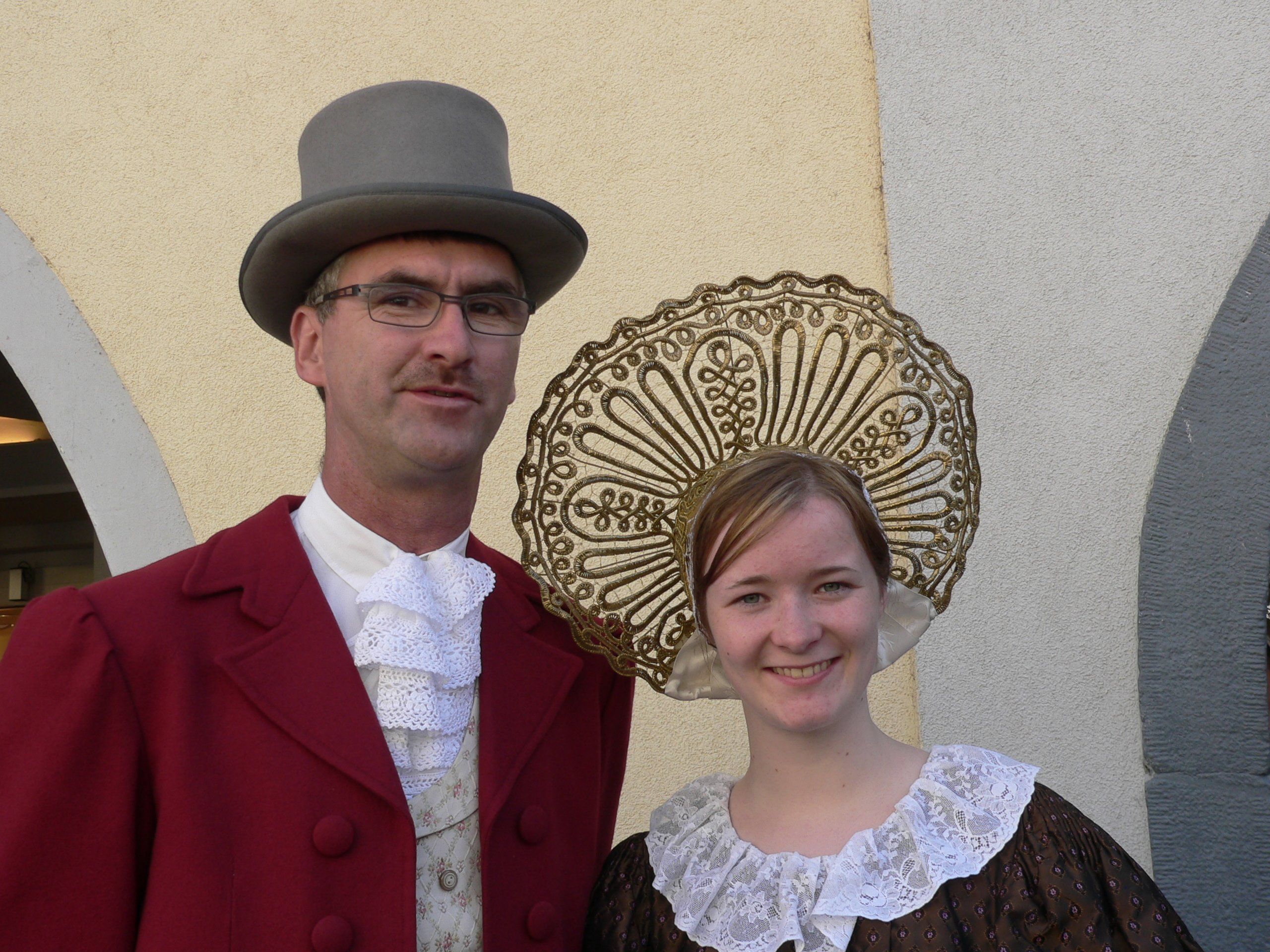 Andreas Stemmer und Delia Klocker in der "Historischen Tracht" mit Zylinder und Goldener Bodensee-Radhaube.