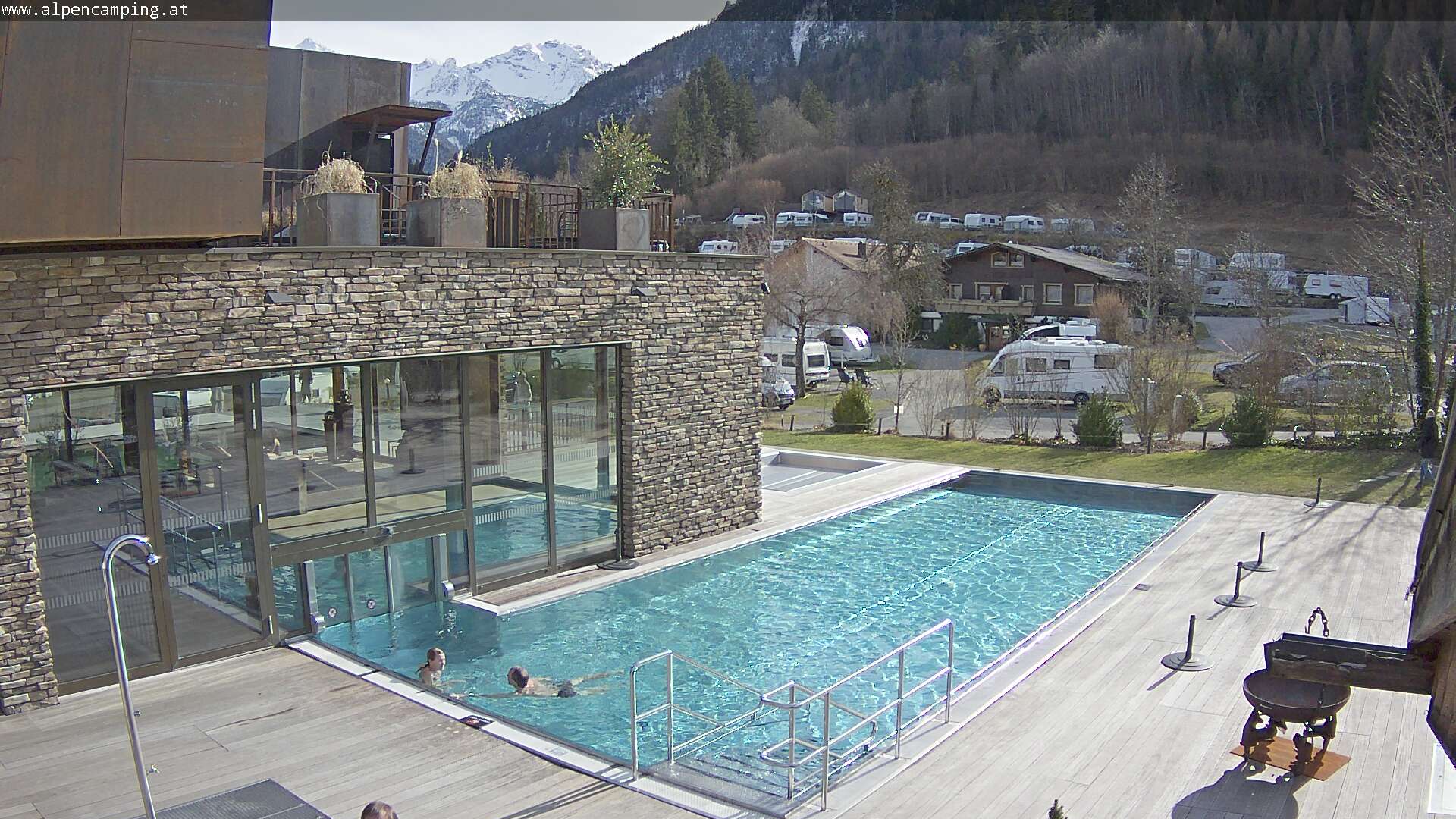 Blick auf den Pool, das Hallenbad und das Außenbad der "Wellness-Oase Alpencamping" in Nenzing. Webcam auf ca. 670 Meter Seehöhe. (Quelle: www.alpencamping.at)