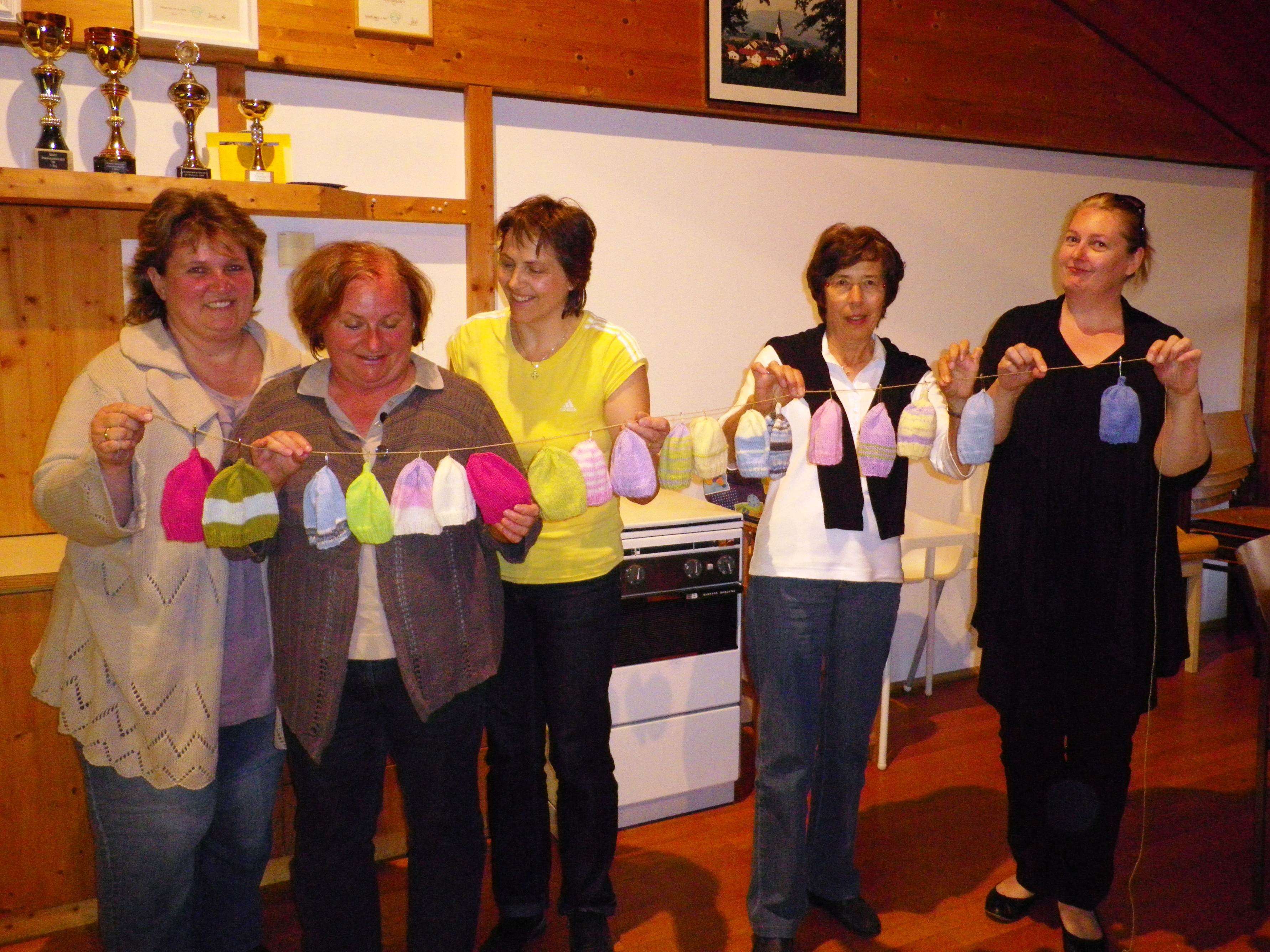 Manuela, Hertha, Maria, Ingeborg und Leiterin Heidi Krischke präsentieren die bis jetzt fertigen Mützen