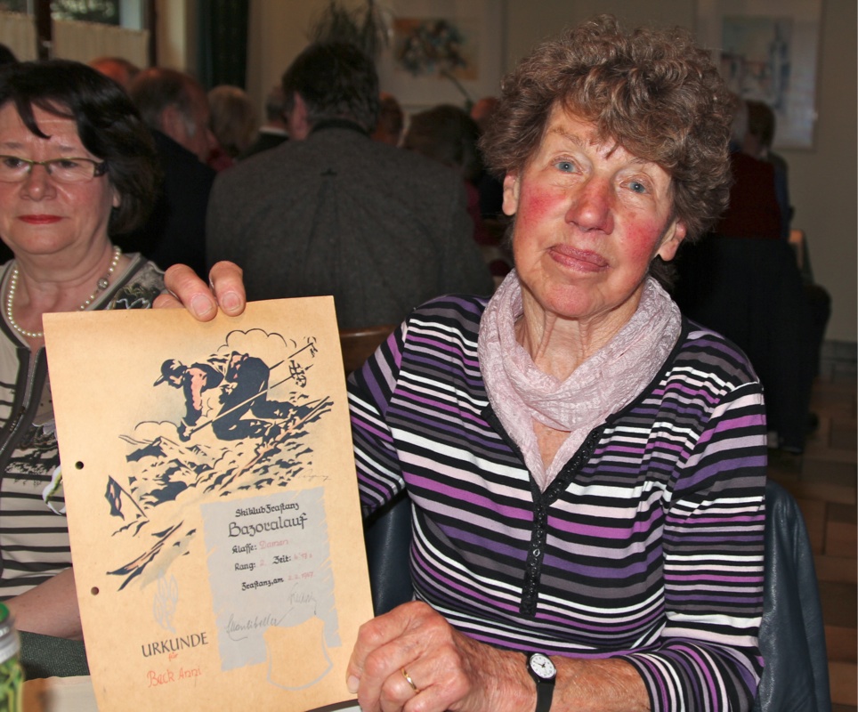Anni Gort stolz mit der Urkunde "2. Platz beim Bazoralauf im Jahre 1947"