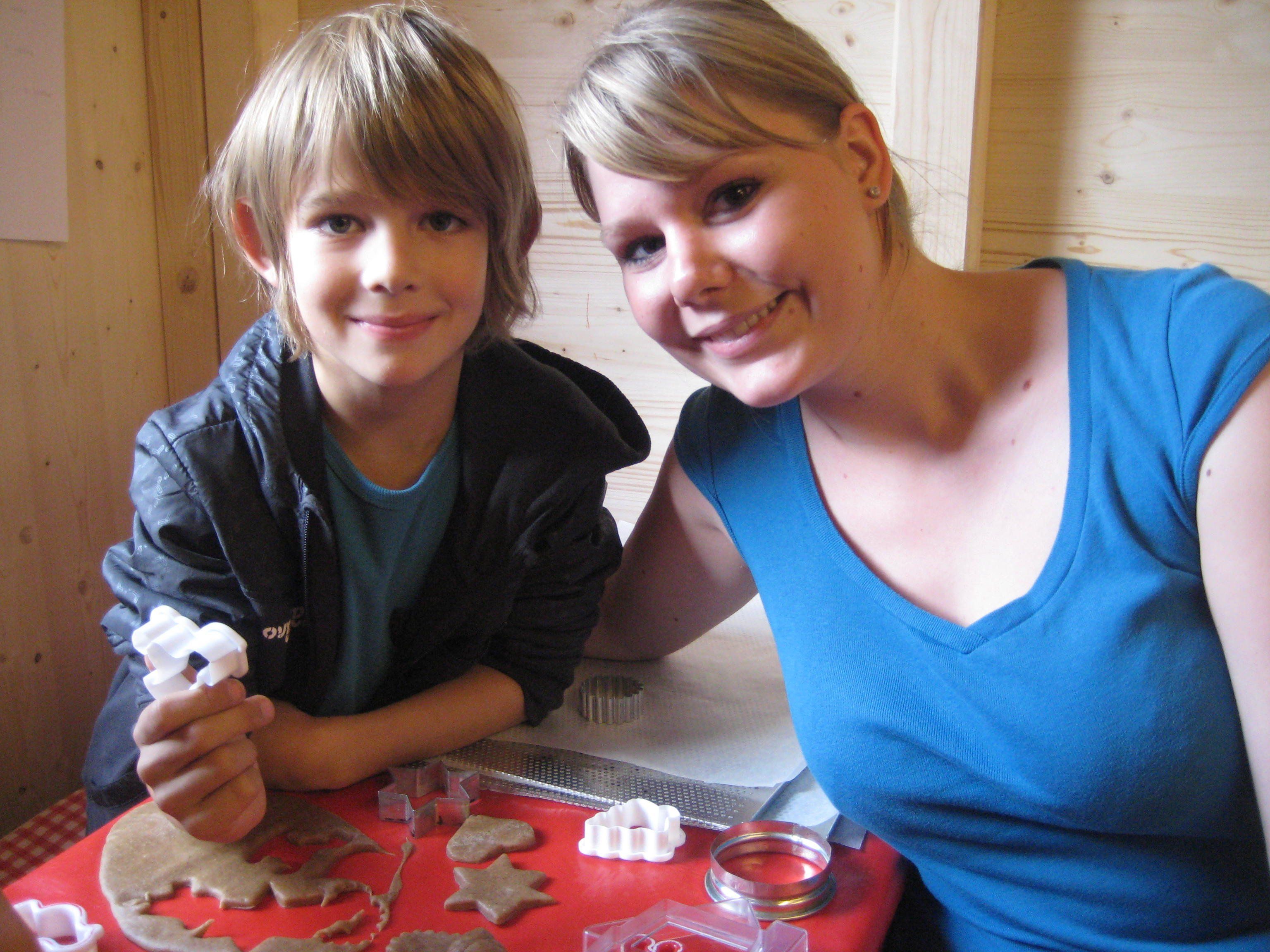 Leon mit Kinderbetreuerin Alena beim Keksle backen im Lebkuchenhaus.