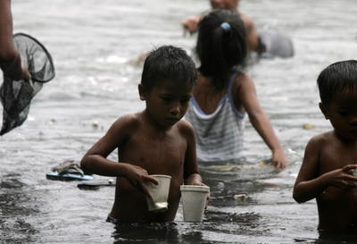 Philippinen: Kinder suchen in der Flut, die von einem Tropensturm herrührt, nach brauchbaren Gegenständen.