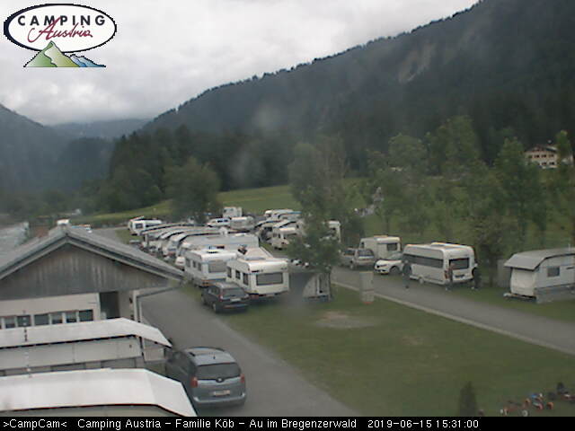 Blick auf den Campingplatz in Au. Webcam auf ca. 815 Meter Seehöhe. (Quelle: www.campingaustria.eu)