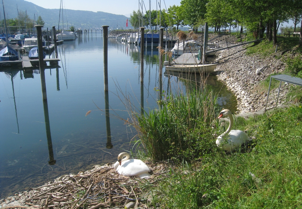 Schwanenpaar nistet im Lochauer Hafen