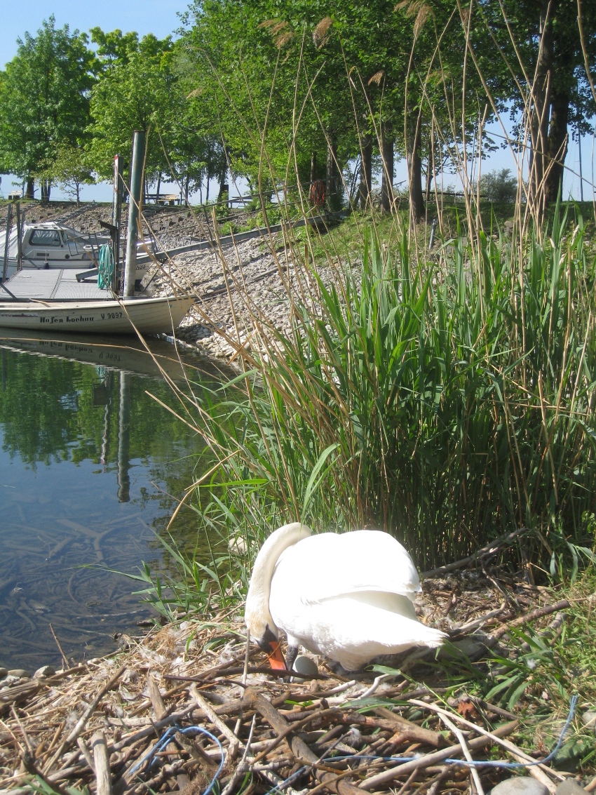 Schwanenpaar nistet im Lochauer Hafen