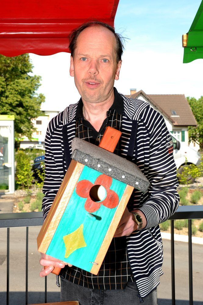 Robert zeigt stolz sein selbst gebasteltes Vogelhäuschen.