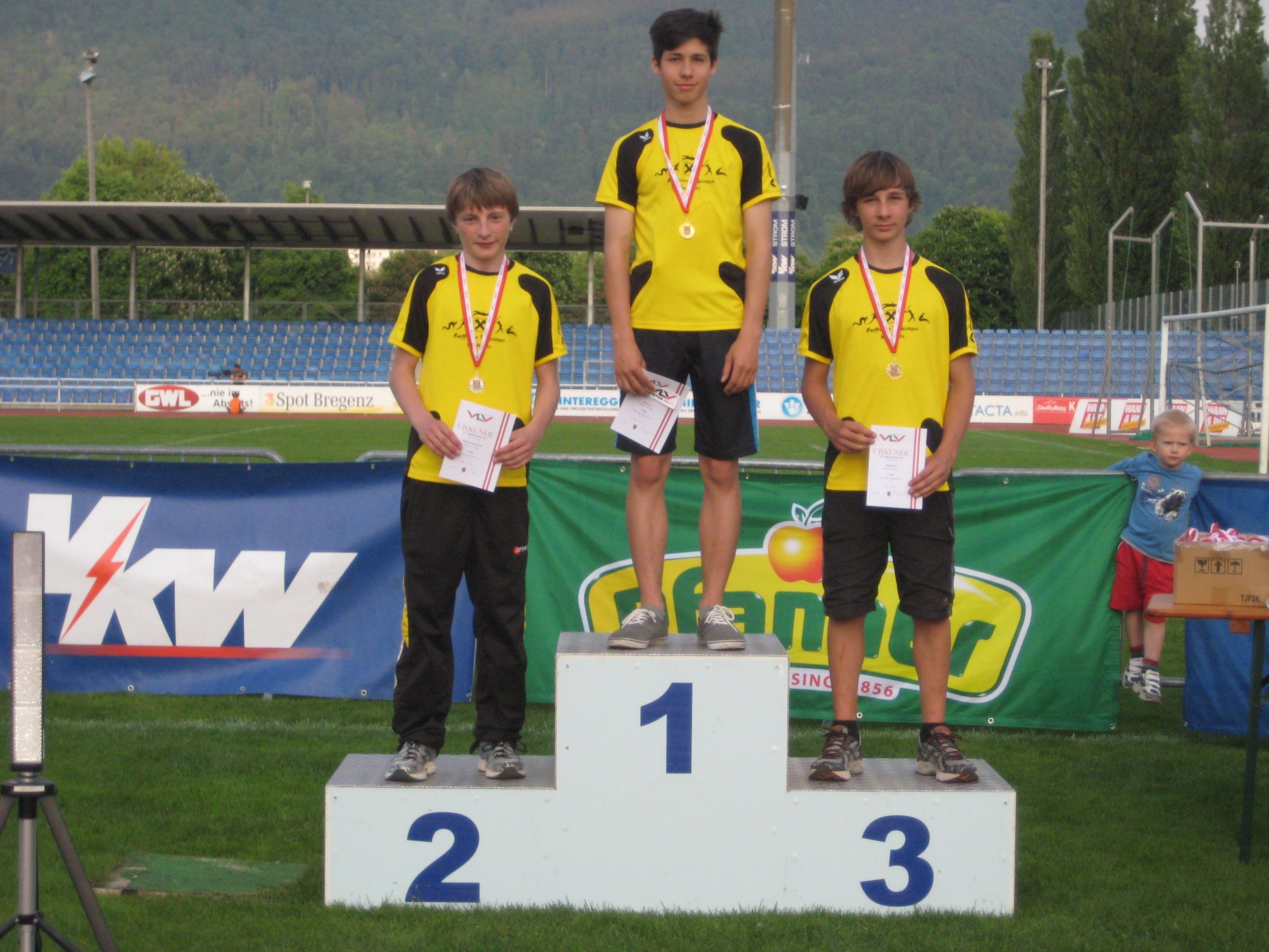 Siegerehrung 100 m Hürden MU16 (1. Julian Eß, 2. Matthias Nussbaumer, 3. Mike Sgarz)