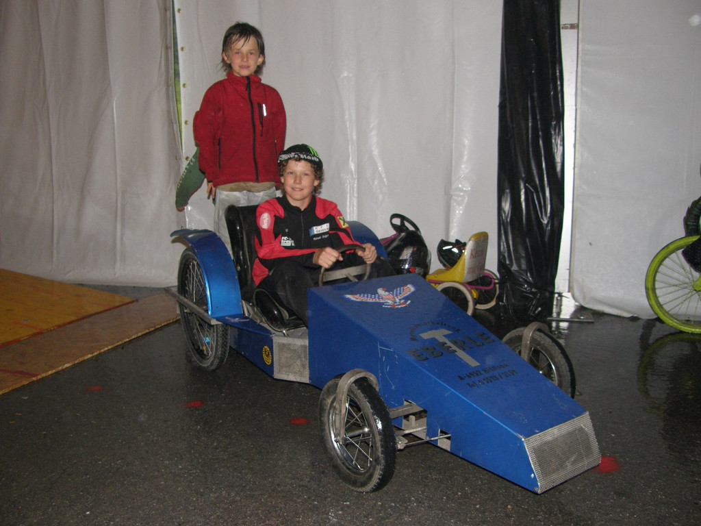 Die Sieger des Konstrukteurbewerbs beim Karrenrennen mit ihrem Gefährt.