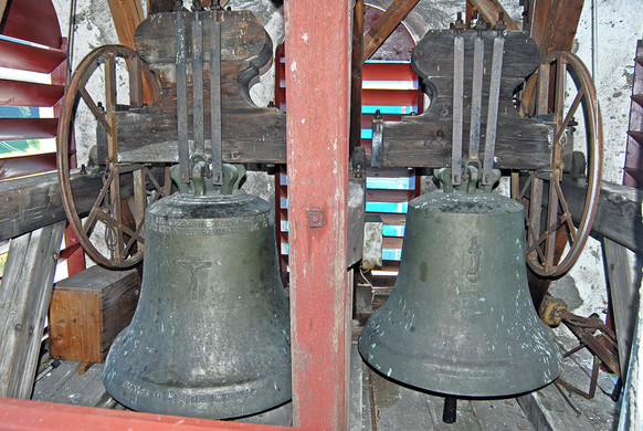 Die zweitgrößte (links) und drittgrößte Glocke der Pfarrkirche Tschagguns. Im Kirchturm hängen insgesamt fünf Glocken. (Foto: Gerhard Scopoli, 31. Juli 2007)