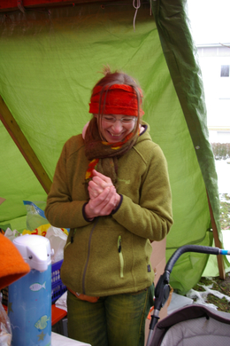 Daniela mit ihren selbstgefilzten Kunstwerken