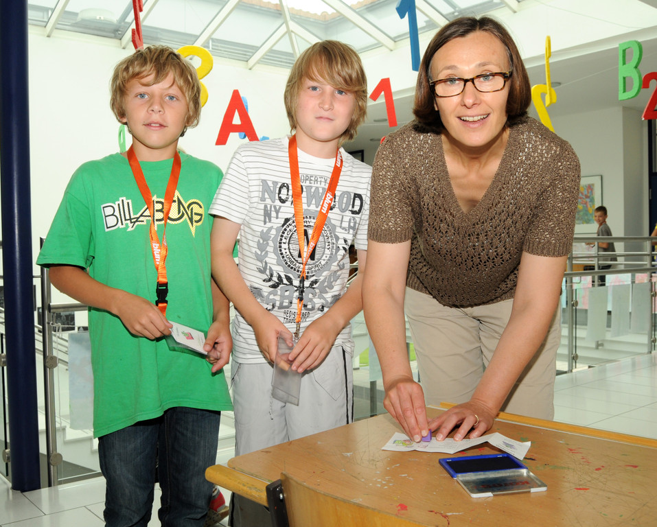 Dir. Helbok mit Simon und Jonas beim Stempeln des Lesepasses
