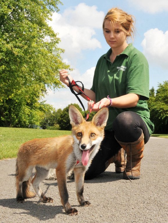 Frau geht mit Fuchswelpen spazieren
