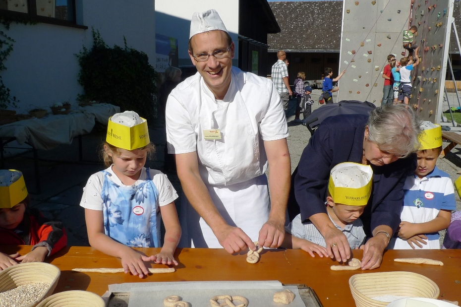 Peter Rheinberger beim Brotbacken mit den kleinen Gästen.