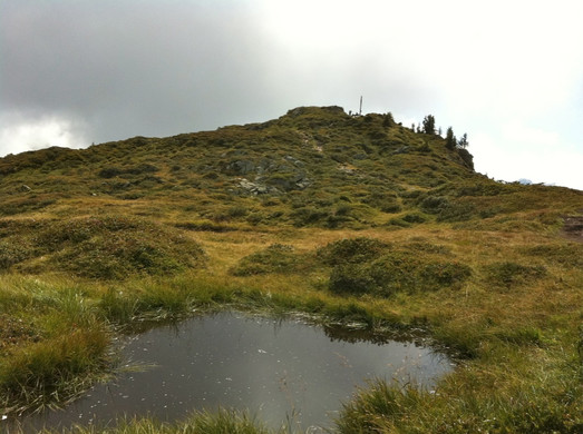 Auf einem etwas steileren Weg geht es vorbei an grün bemoosten Felsbrocken hinauf zum Gipfel des Muttjöchle auf 2.074 m.