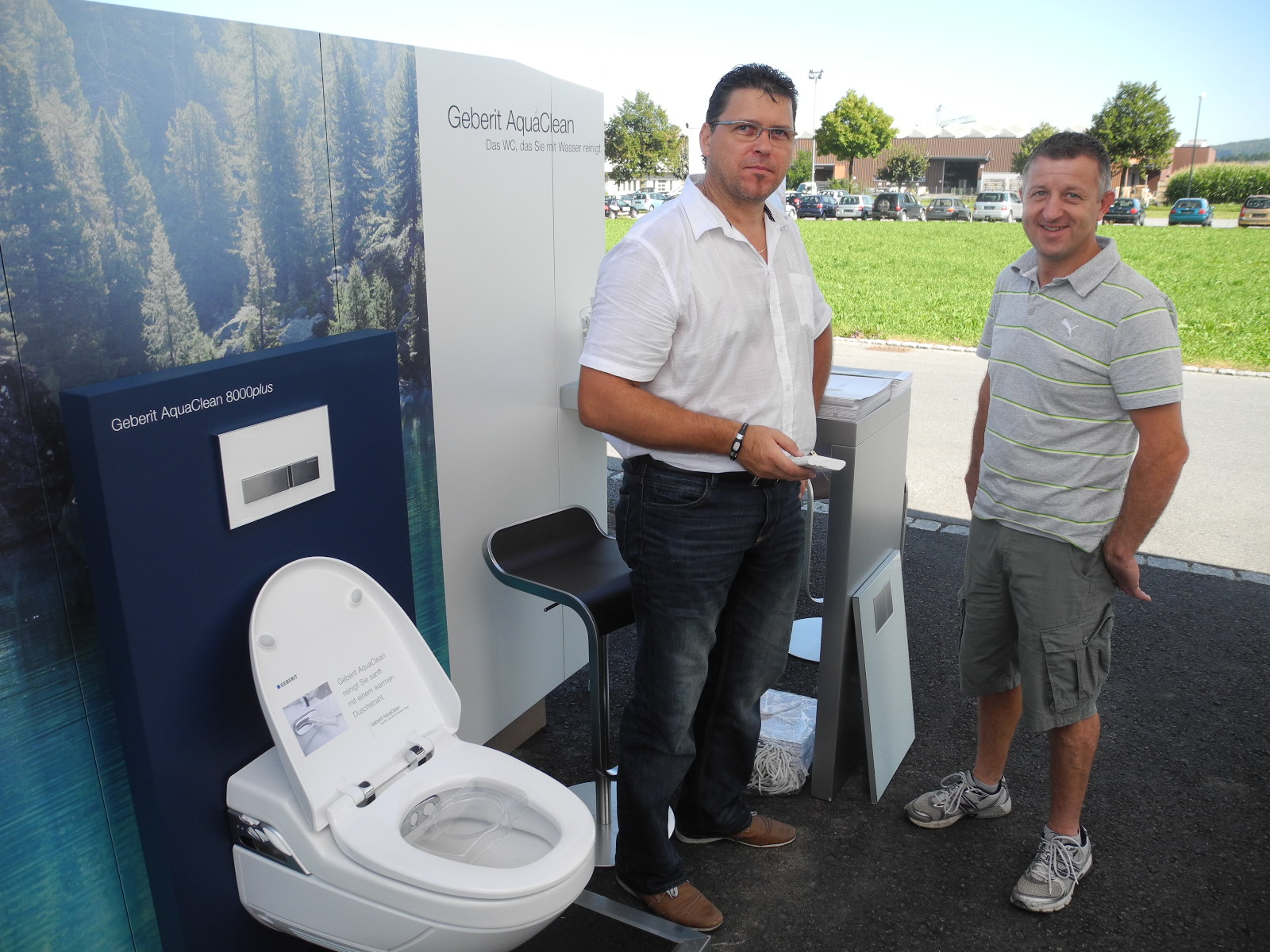 (l.) Thomas Gassner zeigt das neue Geberit WC vor