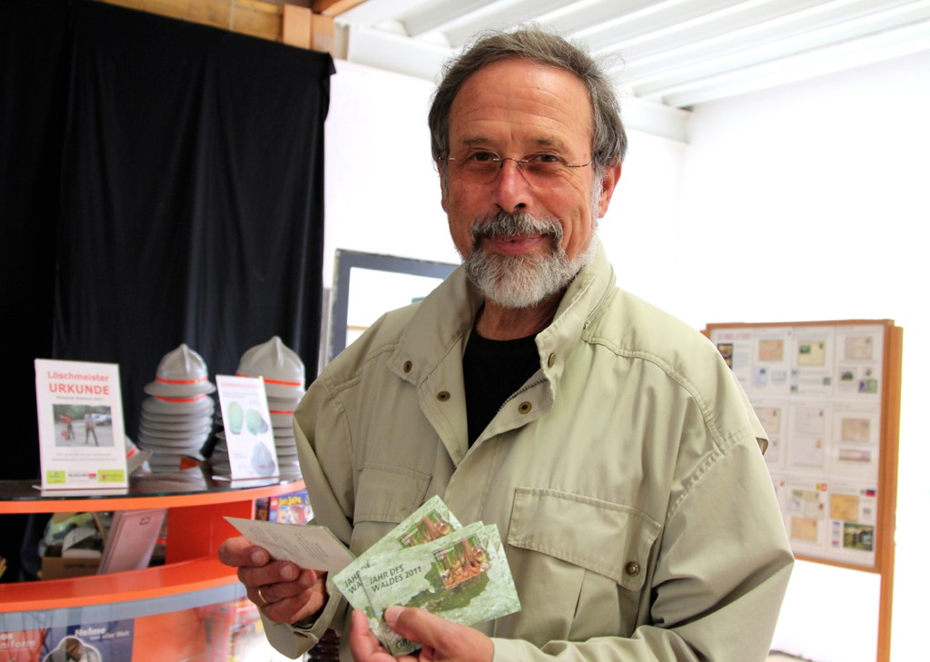 Günter Stadler mit der Sondermarke zum "Jahr des Waldes 2011" inklusive Fichtensamen