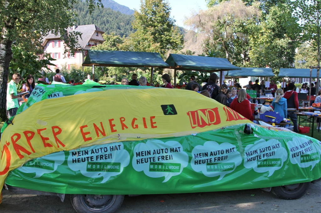 das Verpacken eines Autos von Schülern des Pädagogischen Förderzentrums unter dem Motto „Mein Auto hat heute frei“, war eine Aktionen, die zum Nachdenken anregen sollte