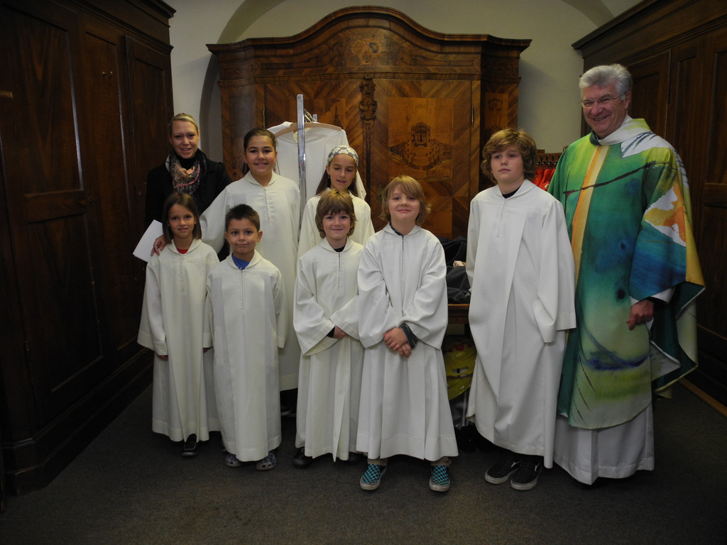 (l.) Gaby von der Thannan mit den Ministranten und Dompfarrer Rudolf Bischof
