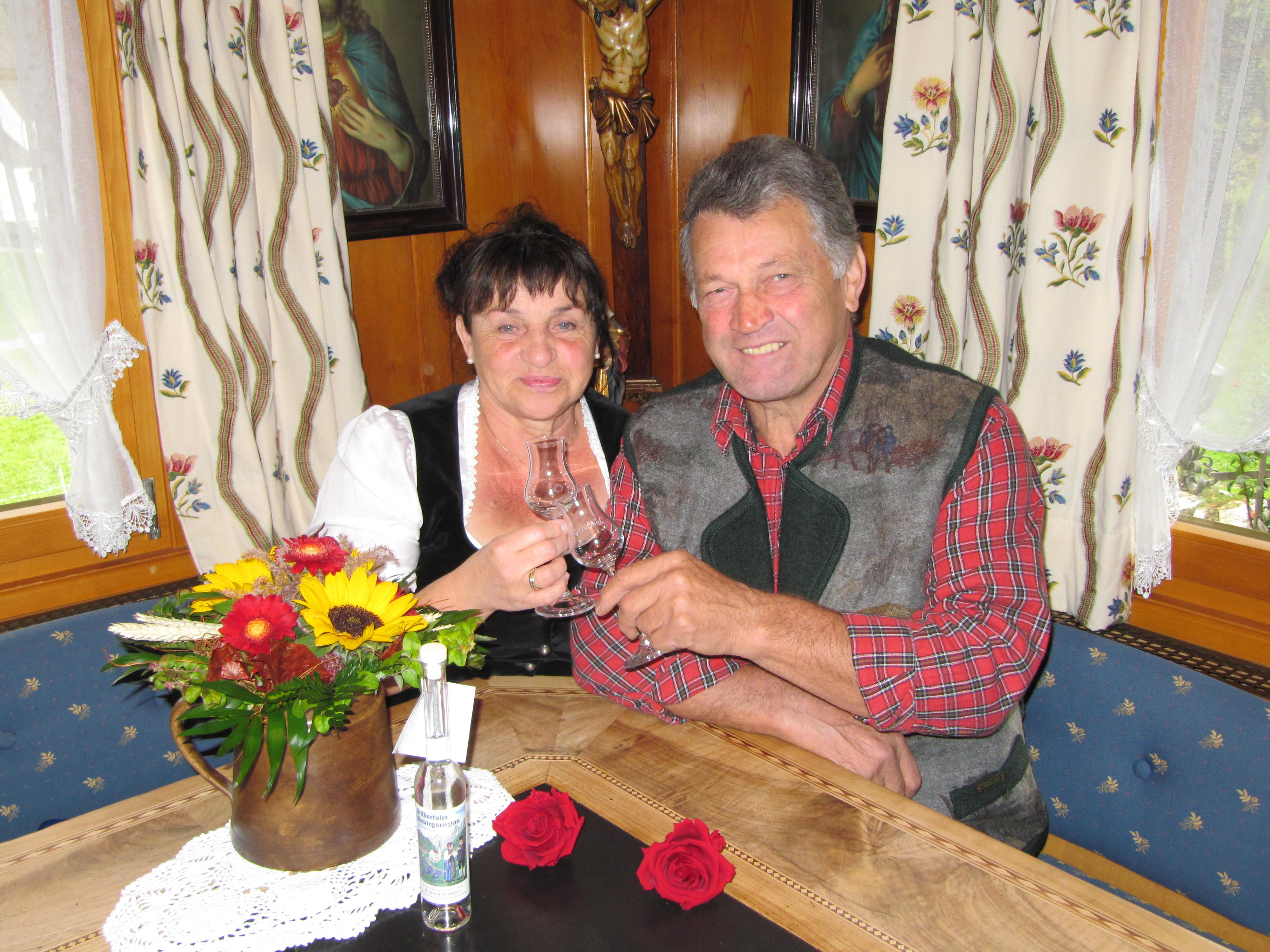 Werner Zudrel gratuliert seiner Eva mit einem Stamperl Enzianschnaps.