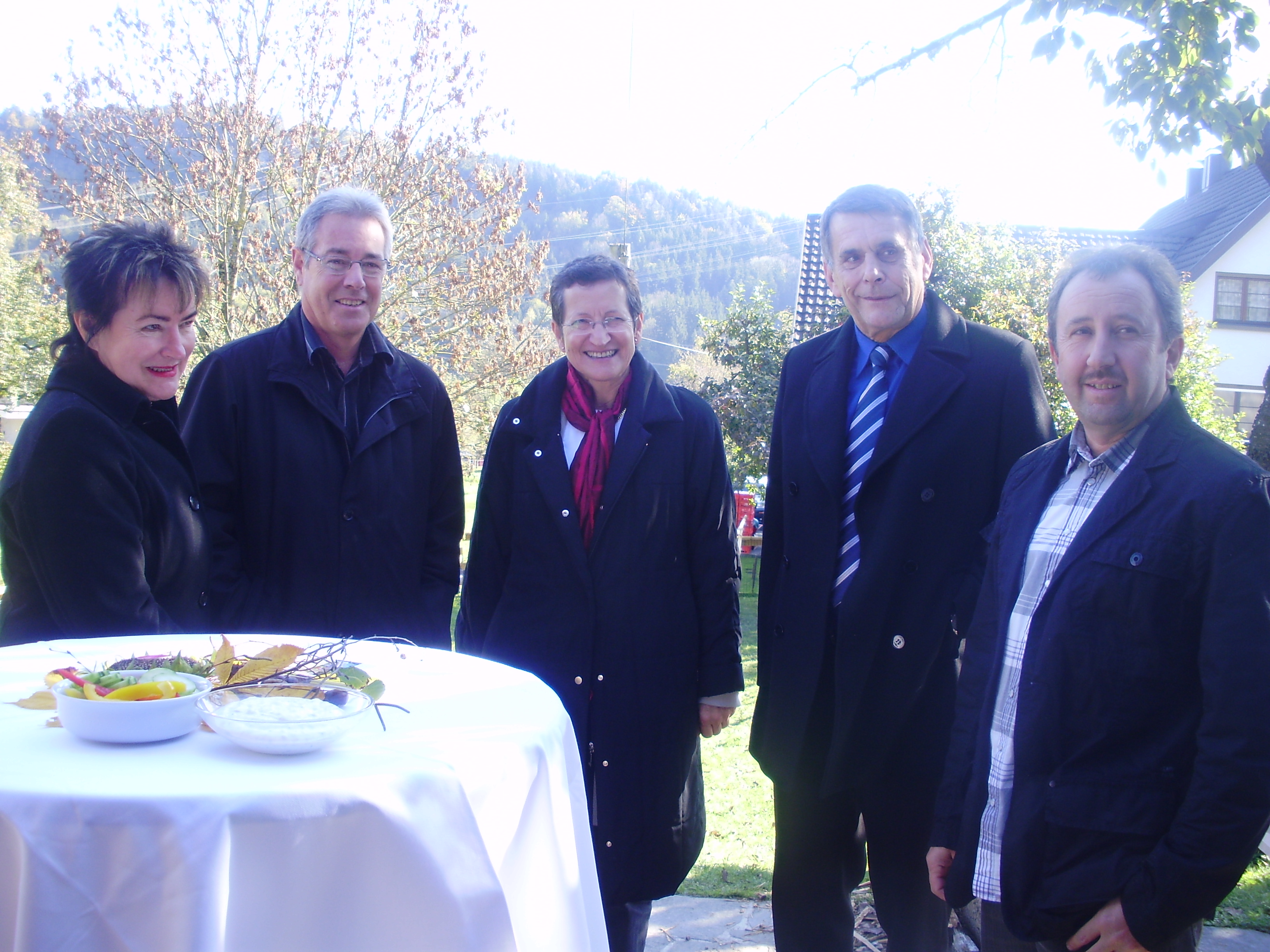 Emma Ströhle (pädag. Fachaufsicht), Bgm. Helmut Lampert, LR Greti Schmid, Bernd Salamon (Bezirkshauptmann) und Vize-Bgm. Klaus Schmid.