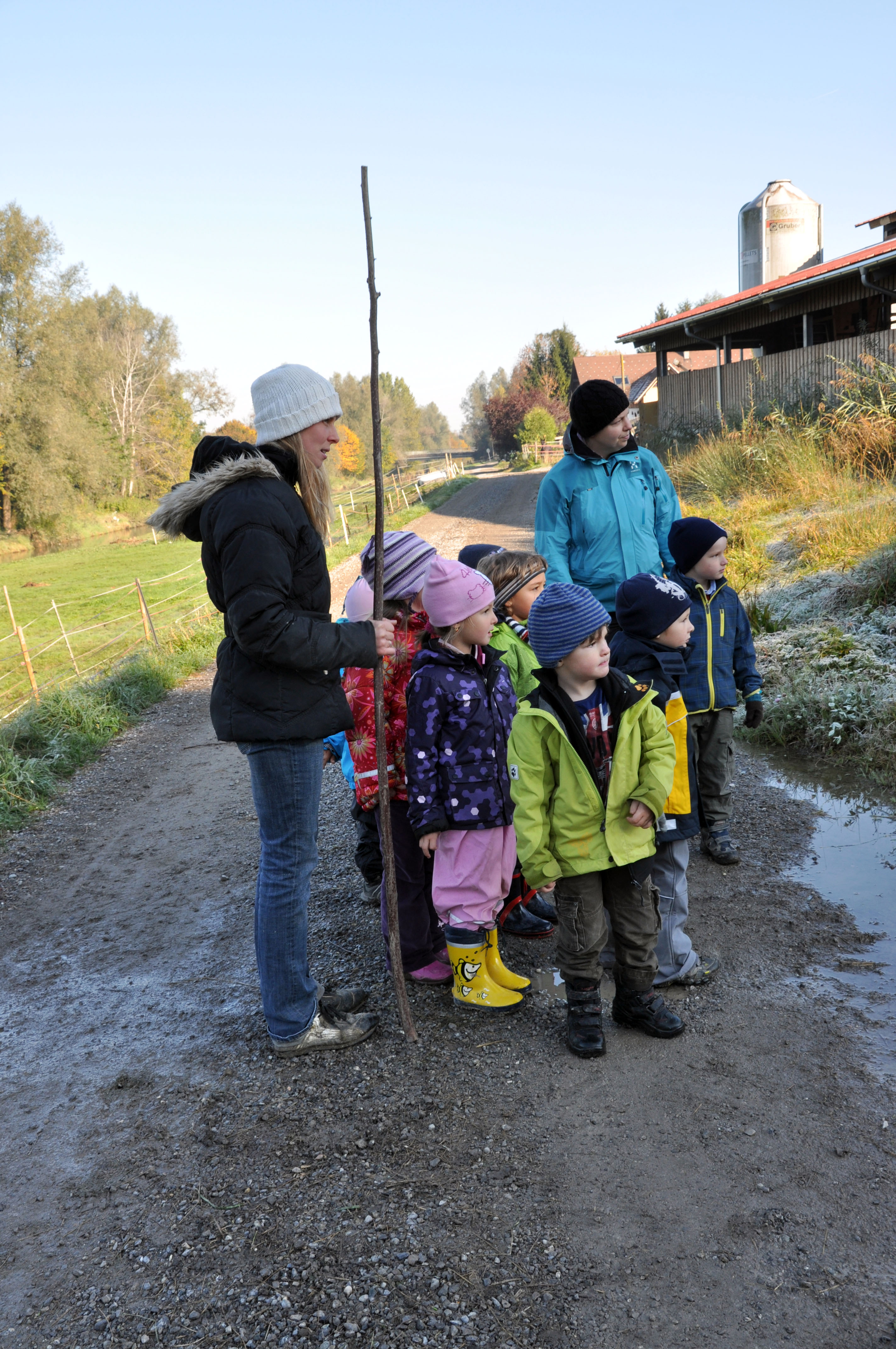 Martina Riedmann wartet mit den Kindern auf die Kühe um sie auf die Weide zu treiben.