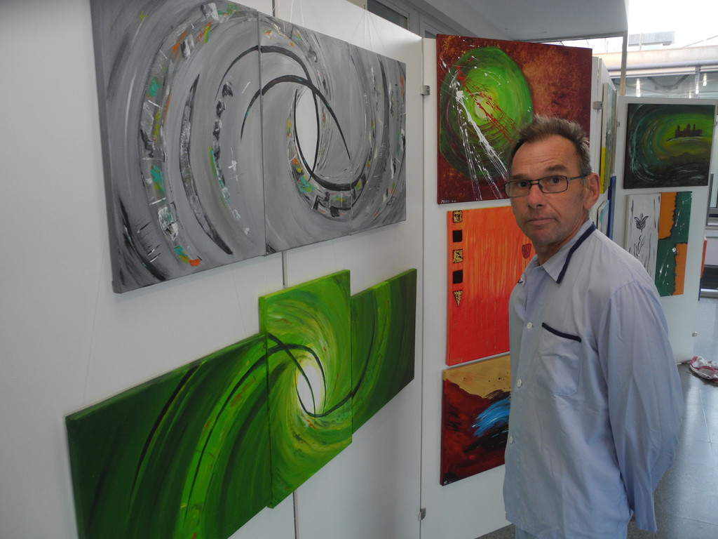 Ein Patient bestaunt die Werke der beiden Künstlerinnen