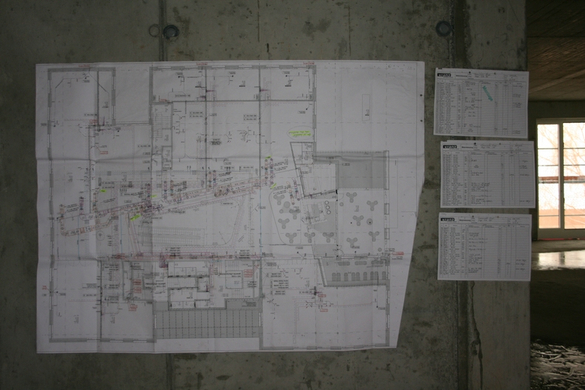 Ein großer Bauplan hängt im ersten Stock des mittleren Gebäudes