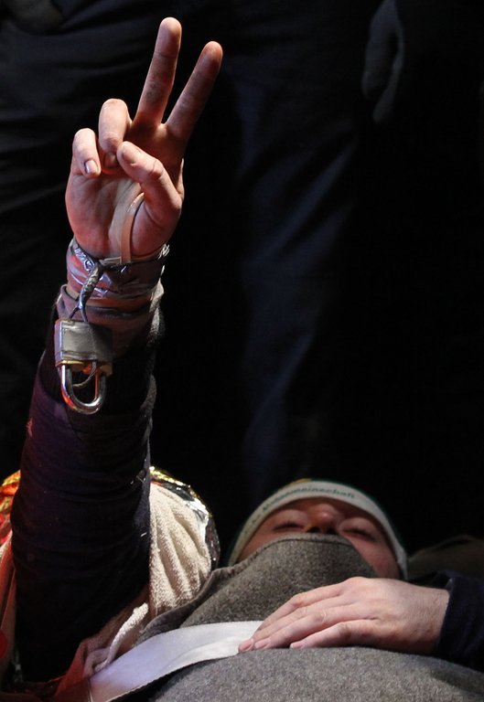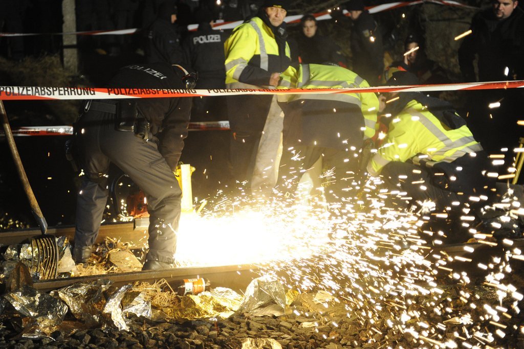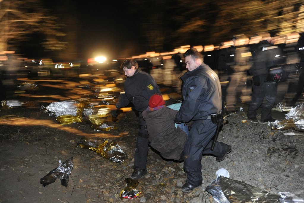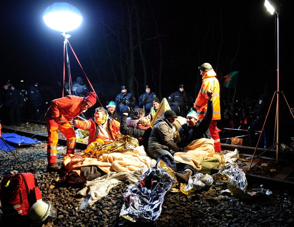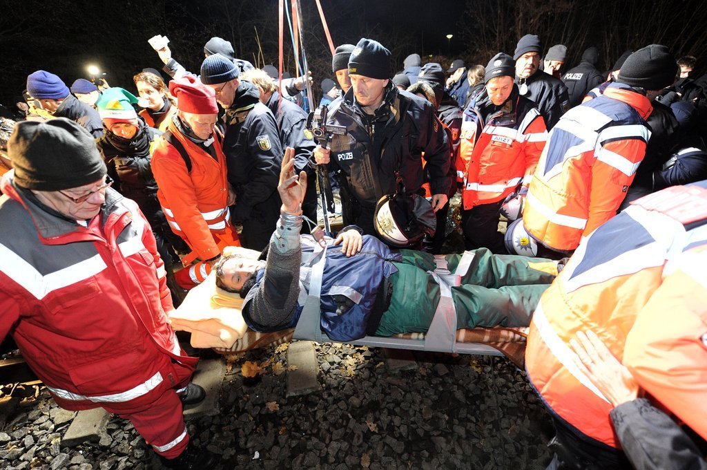Castor-Transport: Polizisten versuchen die Atomkraftgegner vom Gleis zu trennen.