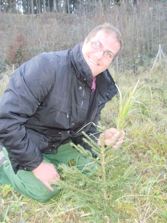 Jürgen präsentiert einen kleinen Christbaum aus eigener Kultur, welcher im letzten Jahr gepflanzt wurde.