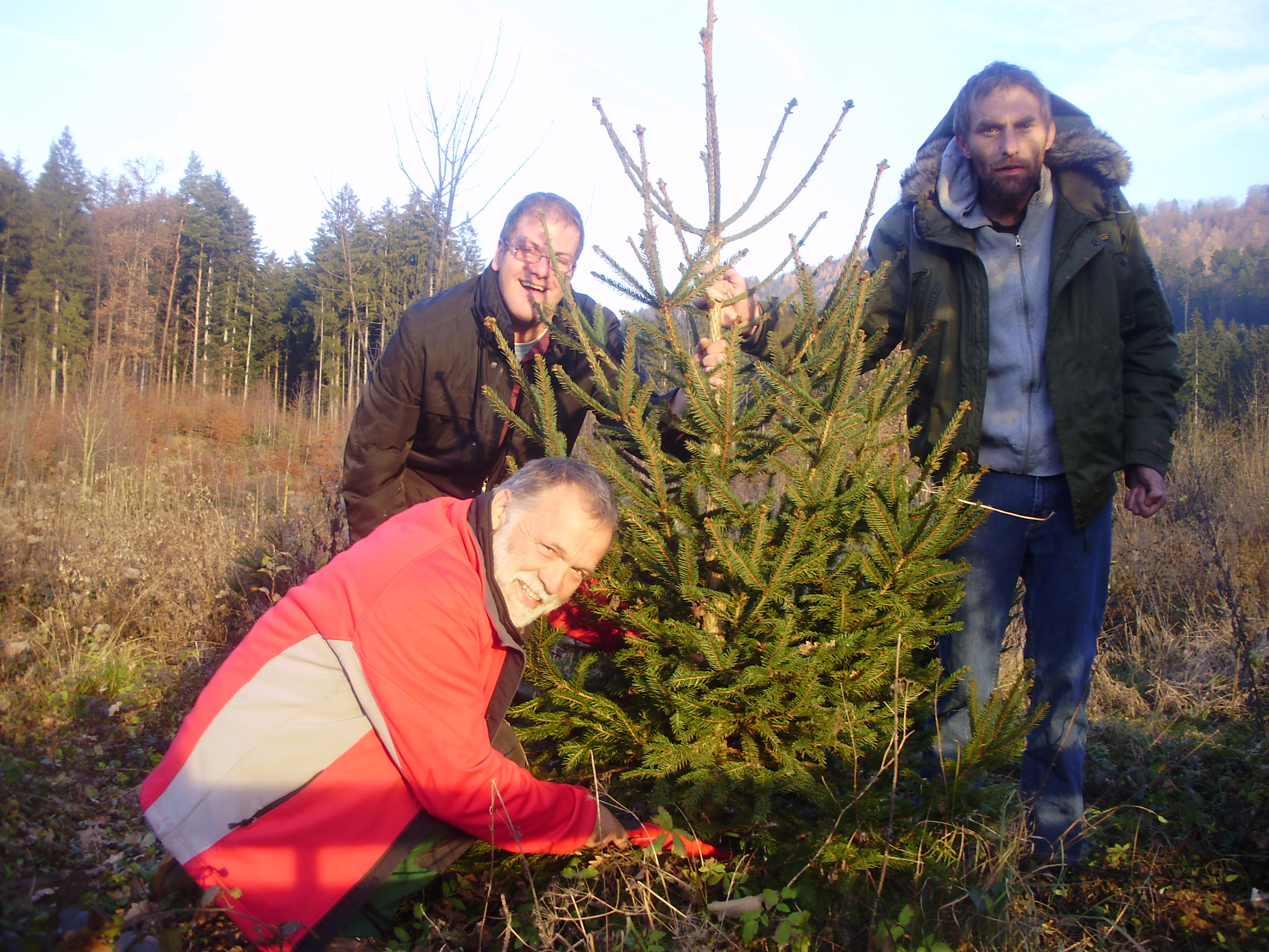 Alois Riedmann mit den Beschäftigten Jürgen und Reini beim Schneiden eines Christbaumes.
