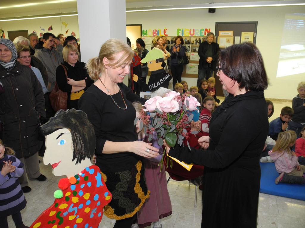 Direktorin Christa Lissy-Rauch überreicht der Künstlerin May-Britt Nayberg-Chromy Bluemen
