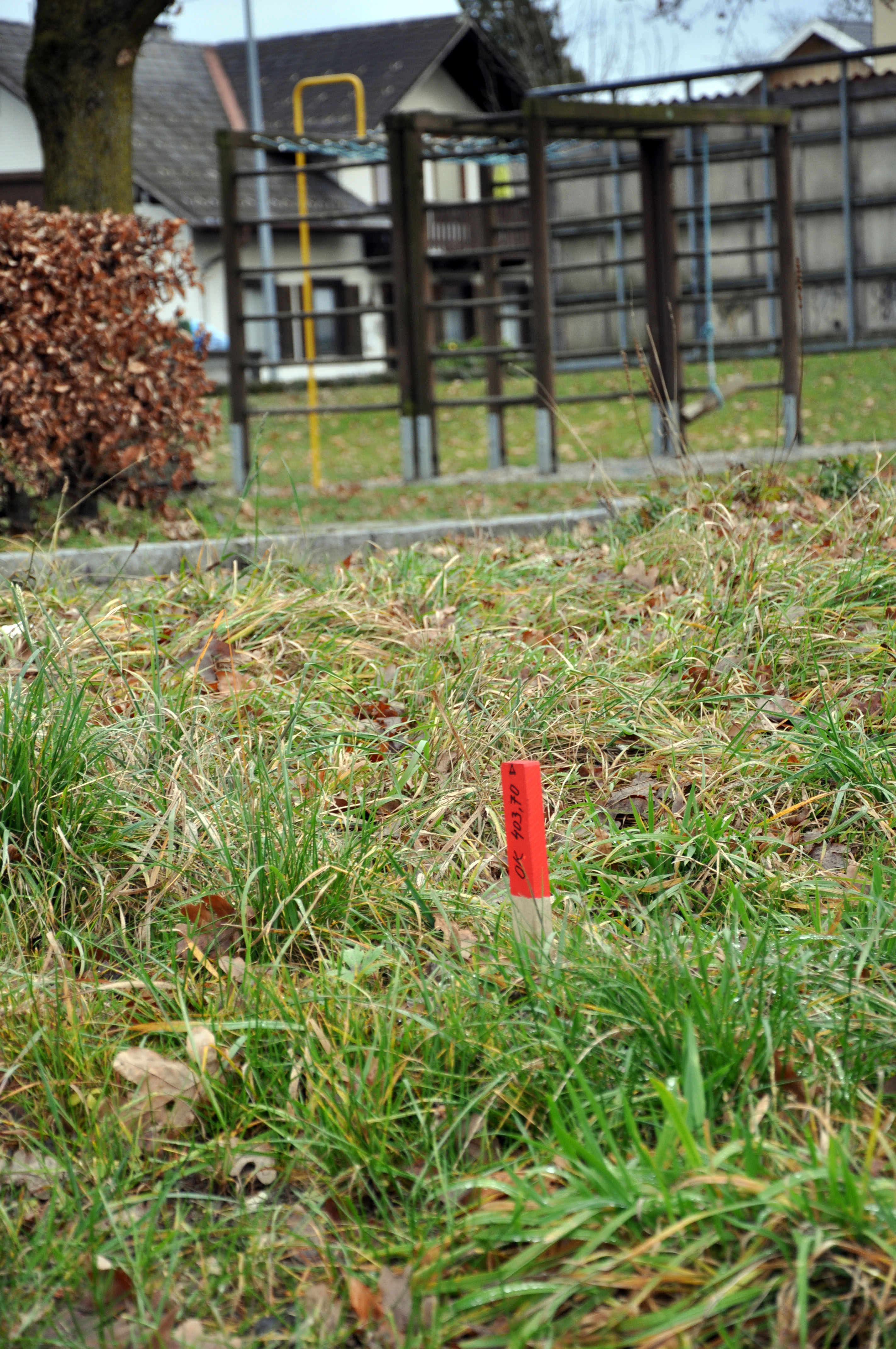 Die Gebäudeecken wurden bereits mit roten Pflöcken markiert.