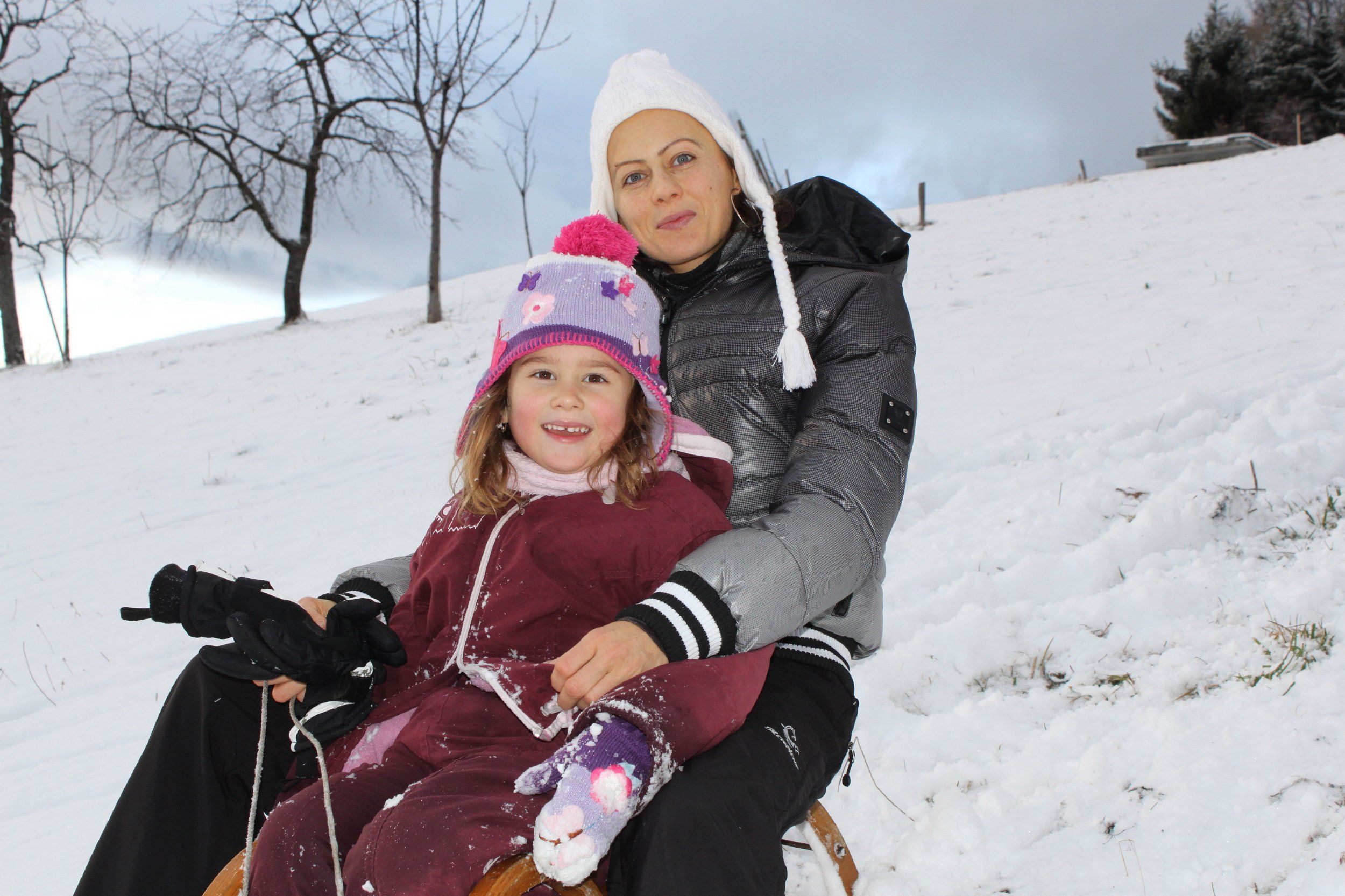 Karin genießt mit ihrer Mama Martina die Rodelpartie