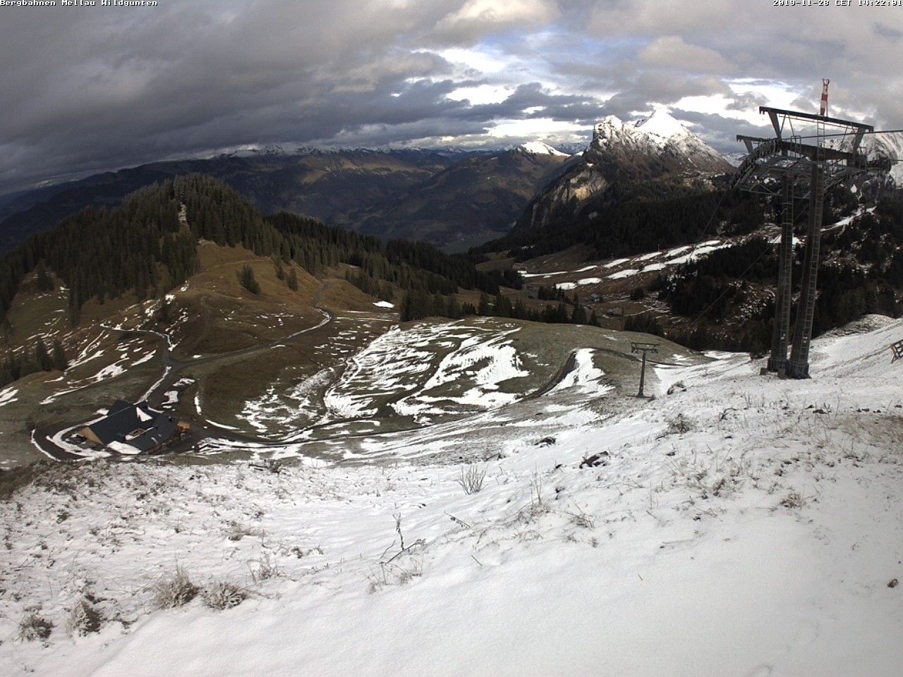 Blick auf das Ski- und Wandergebiet in Damüls. Wildgunten-Livecam auf ca. 1.620 Meter Seehöhe. (Quelle: www.mellau-damüls.at)