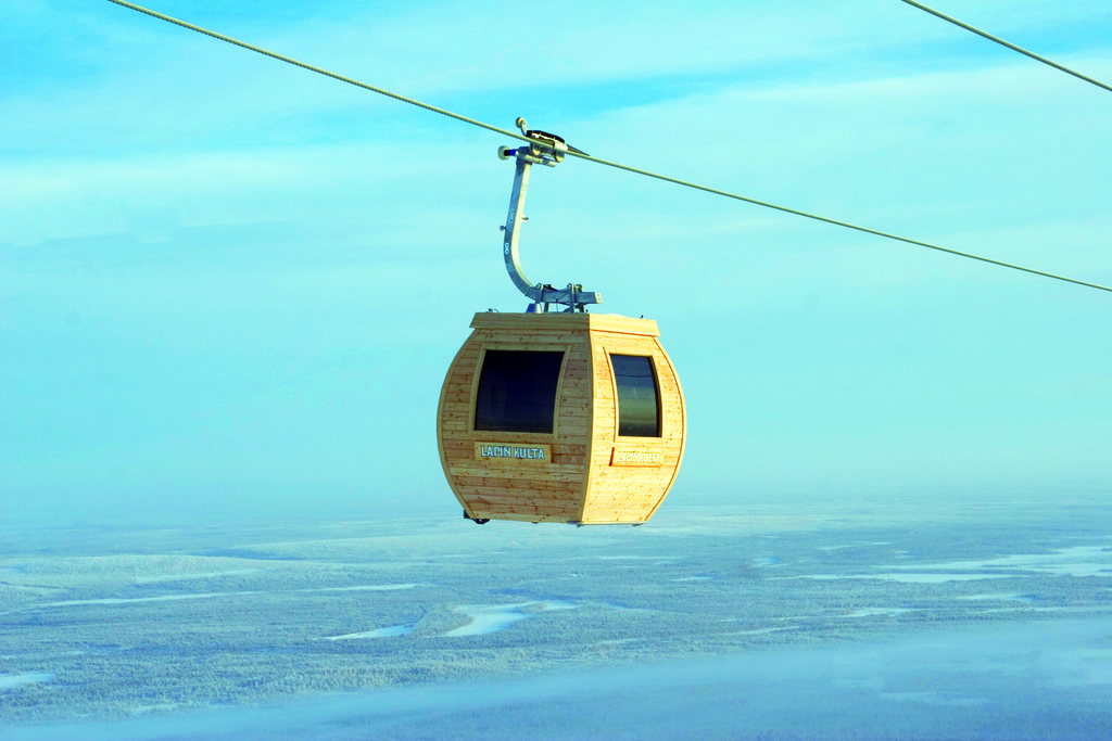 Sauna-Gondel in Ylläs / Finnland: Der erste Sauna-Gondel-Lift der Welt! Ausgestattet mit einem elektrischen Saunaofen, gleitet dieses ungewöhnliche Gefährt in rund 20 Metern Höhe dem Gipfel entgegen. Eine Runde dauert 15 Minuten, jeweils vier Personen können das exotische Saunieren in der Gondel genießen. Dabei bietet sich ein Foto: Ylläs Sport Resort einzigartiger Blick über die Fjäll-Landschaft Lapplands.