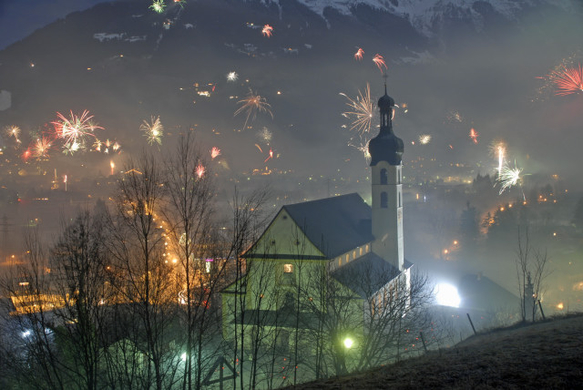 Fröhlich und ausgelasssen wurde in Tschagguns und Schruns der Jahreswechsel gefeiert. Aussichtspunkt: "Mottabühel" hinter der Kirche von Tschagguns. (Foto: Gerhard Scopoli)