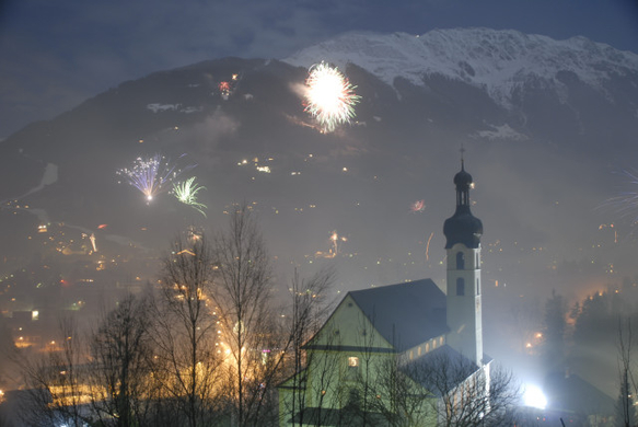 Fröhlich und ausgelasssen wurde in Tschagguns und Schruns der Jahreswechsel gefeiert. Aussichtspunkt: "Mottabühel" hinter der Kirche von Tschagguns. (Foto: Gerhard Scopoli)