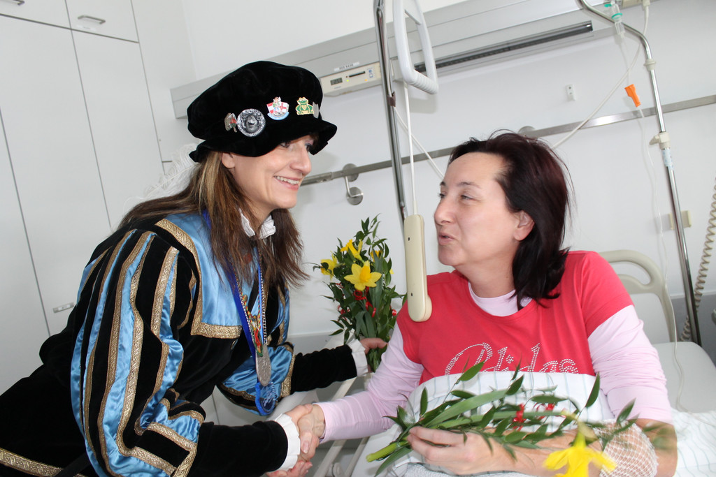 Mit einem duftenden Frühlingsgruß ermuntert Spältabürgerin Magdalena Czindaj eine Patientin.