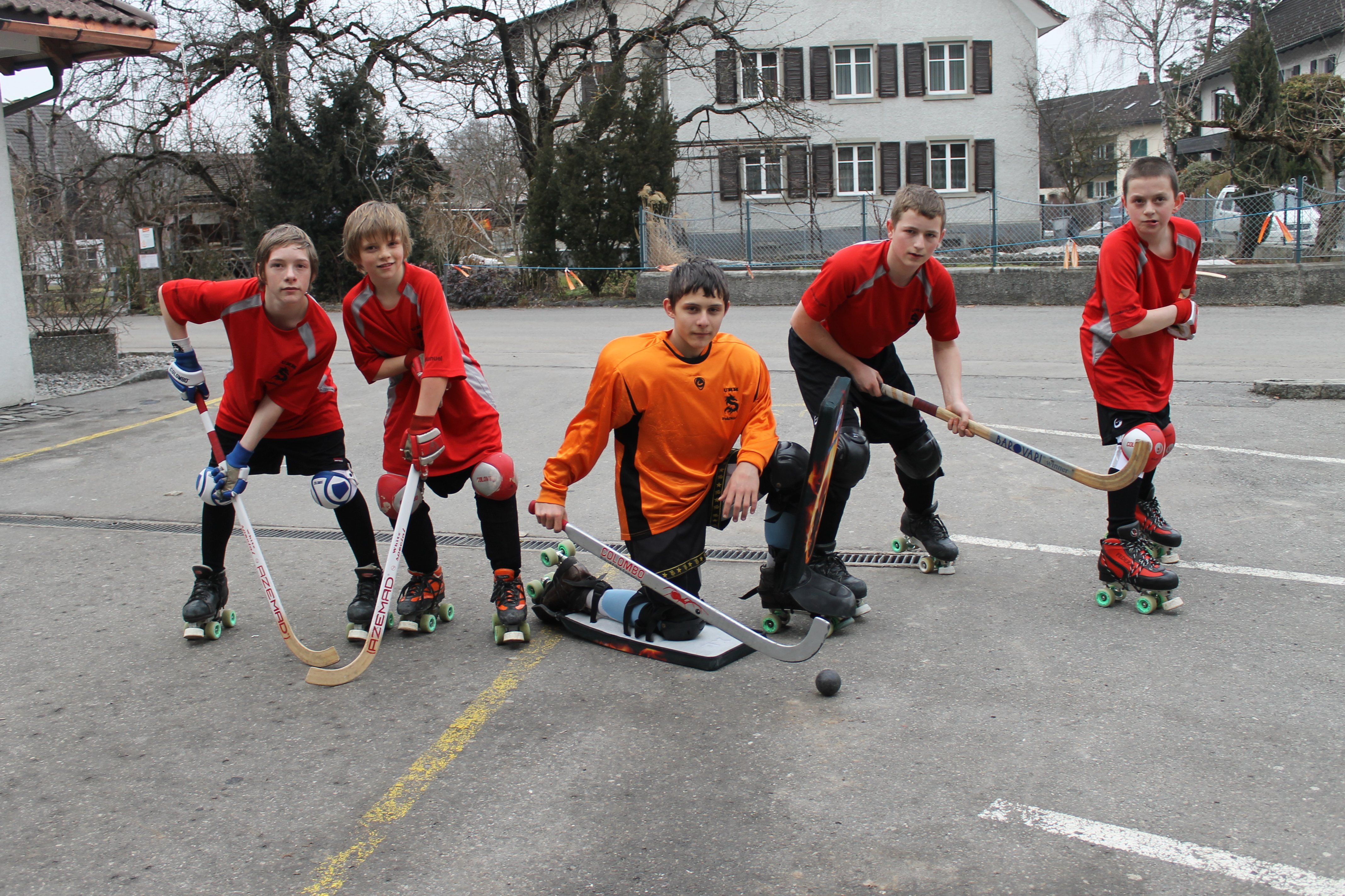 Tobias, Sebastian, Kevin, Dominic und Marcel haben viel Spaß beim Rollhockeyspiel.