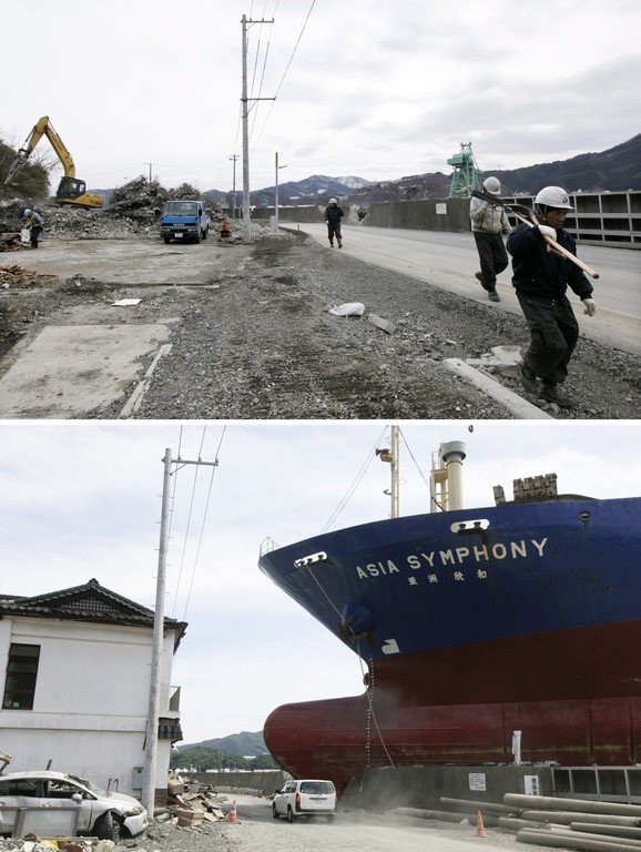 Hafen von Kamaishi in der Präfektur Iwate: Die vom Frachter "Asia Symphony" durchbrochene Mauer ist repariert, das Haus war nicht mehr zu retten.