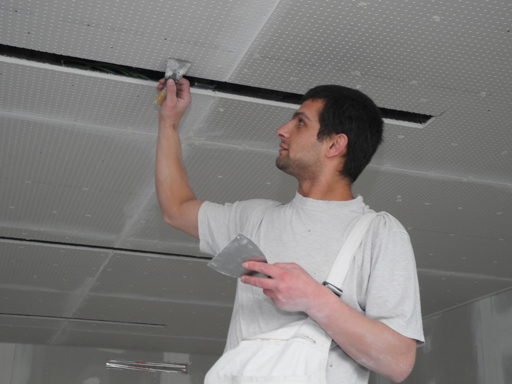 In der Räumen der VMS werden die Gipsdecken eingebaut
