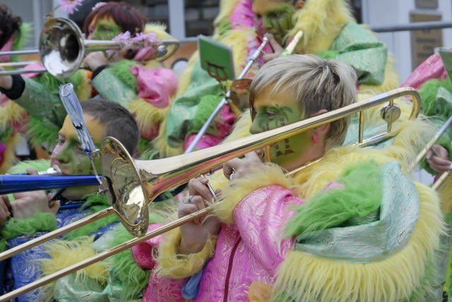 1. Muntafuner Guggamusig Romplbötz und ihr Publikum beim Faschingsauftakt am 11. 11. 2009 am Kirchplatz in Schruns. (Foto: Gerhard Scopoli)