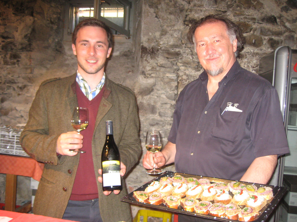 Gasthof Schwarzer Adler: Georg Prieler (Weingut Prieler) und Helmut Biedermann (Schwarzer Adler) mit einem feinen Wein und Brötle mit Bärlauch-Frischkäse, Verhackerts und Grammelschmalz.
