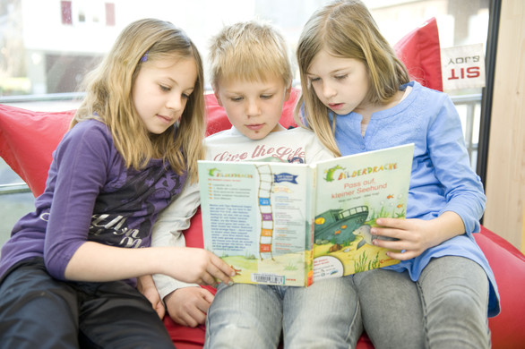 Chiara, Kai und Vivien vertieft in "Pass auf kleiner Seehund".