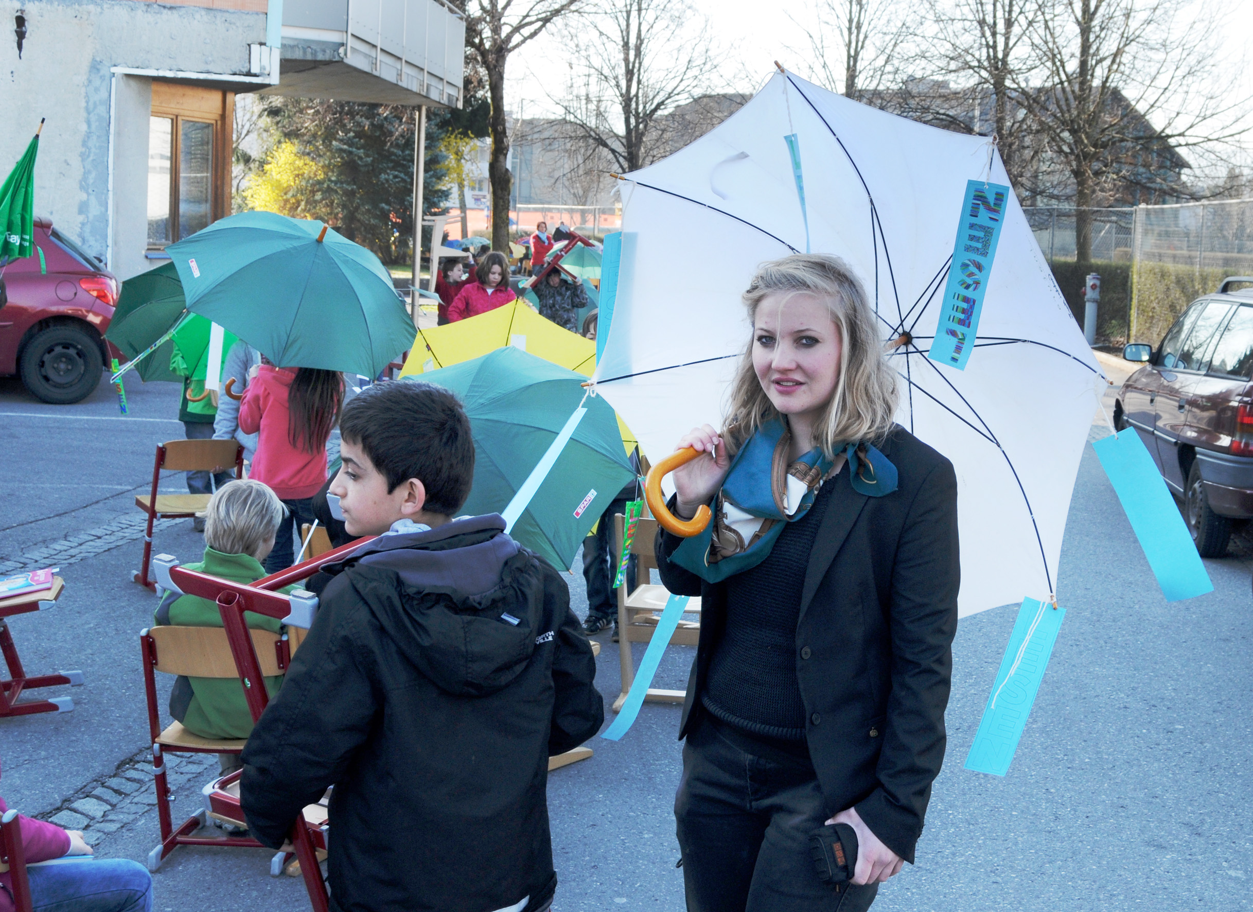Lehrerin Anna Köb samt ,,Lese-Sonnenschirm"