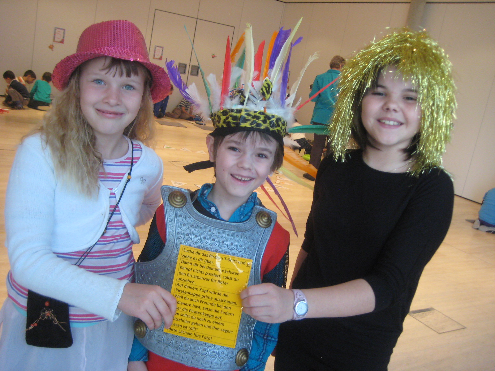 Leseralley: Michelle (4a), Paul (1b) und Jessica (4a) mit einem Lese-Ankleide-Spiel.