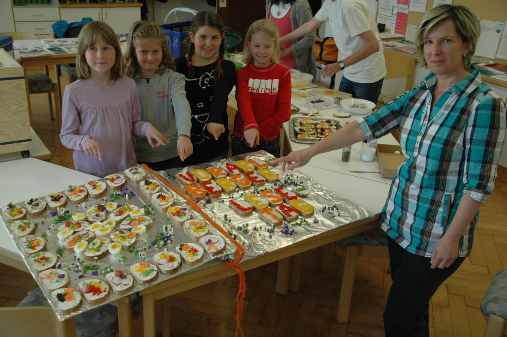 Werklehrerin Ulrike Fenkart mit den Schülerinnen: (v.l.) Antonia, Monique, Hannah & Nadja sie freuen sich auf die Jause! (VS Markt)